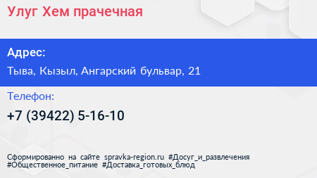 Улуг-Хем, прачечная по адресу Тыва, Кызыл, Ангарский бульвар, 21 в дальнейшем Организация, размещена в следующих категориях: