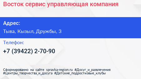Восток сервис, управляющая компания по адресу Тыва, Кызыл, Дружбы, 3 в дальнейшем Организация, размещена в следующих категориях: