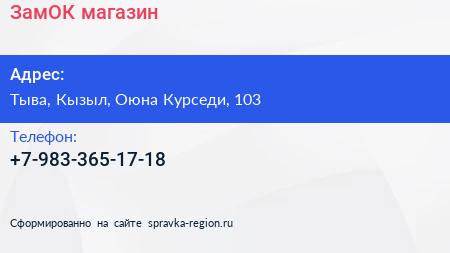 ЗамОК, магазин по адресу Тыва, Кызыл, Оюна Курседи, 103 в дальнейшем Организация, размещена в следующих категориях: