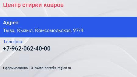 Центр стирки ковров по адресу Тыва, Кызыл, Комсомольская, 97/4 в дальнейшем Организация, размещена в следующих категориях: