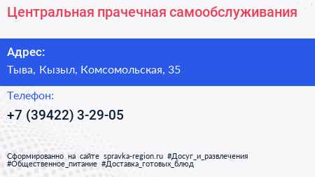 Центральная, прачечная самообслуживания по адресу Тыва, Кызыл, Комсомольская, 35 в дальнейшем Организация, размещена в следующих категориях: