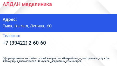 АЛДАН, медклиника по адресу Тыва, Кызыл, Ленина, 60 в дальнейшем Организация, размещена в следующих категориях: