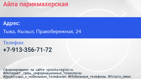 Айла, парикмахерская по адресу Тыва, Кызыл, Правобережная, 24 в дальнейшем Организация, размещена в следующих категориях: