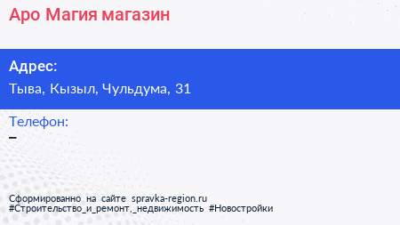 Аро Магия, магазин по адресу Тыва, Кызыл, Чульдума, 31 в дальнейшем Организация, размещена в следующих категориях: