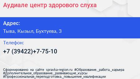 Аудиале, центр здорового слуха по адресу Тыва, Кызыл, Бухтуева, 3 в дальнейшем Организация, размещена в следующих категориях: