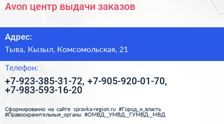 Avon, центр выдачи заказов по адресу Тыва, Кызыл, Комсомольская, 21 в дальнейшем Организация, размещена в следующих категориях: