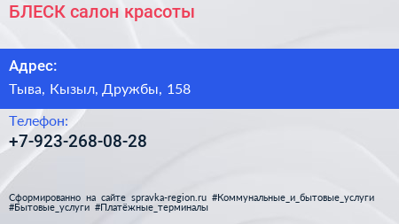 БЛЕСК, салон красоты по адресу Тыва, Кызыл, Дружбы, 158 в дальнейшем Организация, размещена в следующих категориях:
