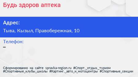 Будь здоров, аптека по адресу Тыва, Кызыл, Правобережная, 10 в дальнейшем Организация, размещена в следующих категориях: