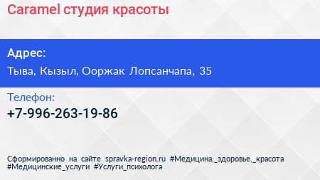 Caramel, студия красоты по адресу Тыва, Кызыл, Ооржак Лопсанчапа, 35 в дальнейшем Организация, размещена в следующих категориях:
