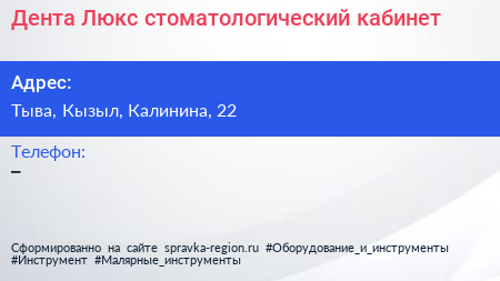 Дента-Люкс, стоматологический кабинет по адресу Тыва, Кызыл, Калинина, 22 в дальнейшем Организация, размещена в следующих категориях: