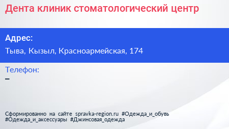 Дента клиник, стоматологический центр по адресу Тыва, Кызыл, Красноармейская, 174 в дальнейшем Организация, размещена в следующих категориях: