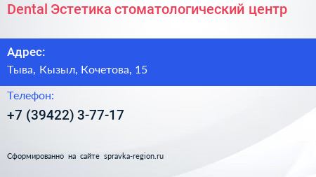 Dental Эстетика, стоматологический центр по адресу Тыва, Кызыл, Кочетова, 15 в дальнейшем Организация, размещена в следующих категориях: