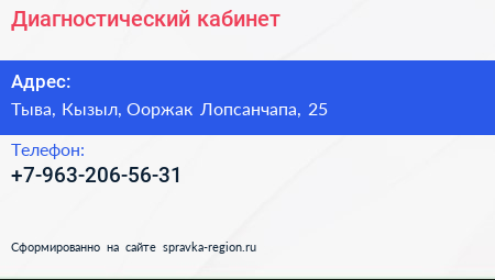 Диагностический кабинет по адресу Тыва, Кызыл, Ооржак Лопсанчапа, 25 в дальнейшем Организация, размещена в следующих категориях: