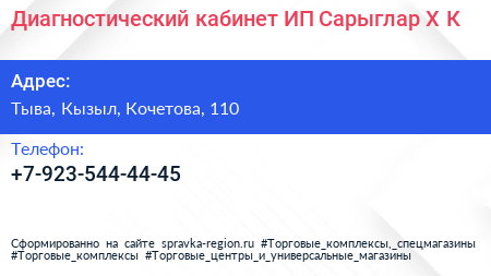 Диагностический кабинет, ИП Сарыглар Х.К. по адресу Тыва, Кызыл, Кочетова, 110 в дальнейшем Организация, размещена в следующих категориях: