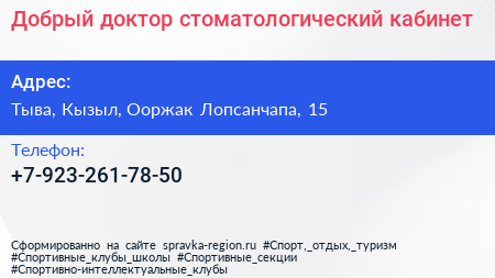 Добрый доктор, стоматологический кабинет по адресу Тыва, Кызыл, Ооржак Лопсанчапа, 15 в дальнейшем Организация, размещена в следующих категориях: