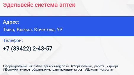 Эдельвейс, система аптек по адресу Тыва, Кызыл, Кочетова, 99 в дальнейшем Организация, размещена в следующих категориях: