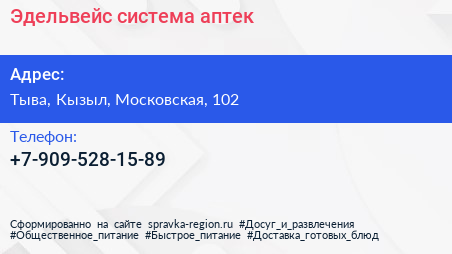 Эдельвейс, система аптек по адресу Тыва, Кызыл, Московская, 102 в дальнейшем Организация, размещена в следующих категориях: