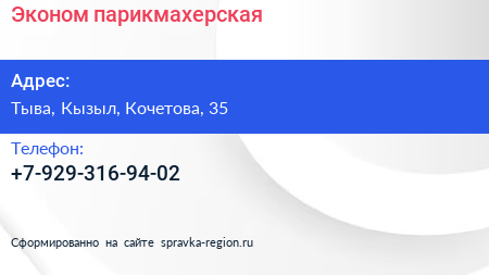 Эконом-парикмахерская по адресу Тыва, Кызыл, Кочетова, 35 в дальнейшем Организация, размещена в следующих категориях: