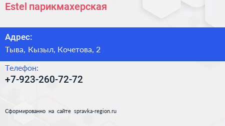 Estel, парикмахерская по адресу Тыва, Кызыл, Кочетова, 2 в дальнейшем Организация, размещена в следующих категориях: