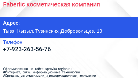 Faberlic, косметическая компания по адресу Тыва, Кызыл, Тувинских Добровольцев, 13 в дальнейшем Организация, размещена в следующих категориях: