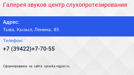 Галерея звуков, центр слухопротезирования по адресу Тыва, Кызыл, Ленина, 85 в дальнейшем Организация, размещена в следующих категориях: