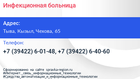 Инфекционная больница по адресу Тыва, Кызыл, Чехова, 65 в дальнейшем Организация, размещена в следующих категориях: