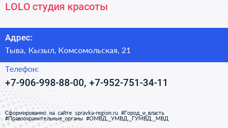 LOLO, студия красоты по адресу Тыва, Кызыл, Комсомольская, 21 в дальнейшем Организация, размещена в следующих категориях: