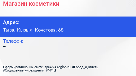 Магазин косметики по адресу Тыва, Кызыл, Кочетова, 68 в дальнейшем Организация, размещена в следующих категориях: