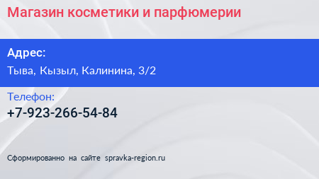 Магазин косметики и парфюмерии по адресу Тыва, Кызыл, Калинина, 3/2 в дальнейшем Организация, размещена в следующих категориях:
