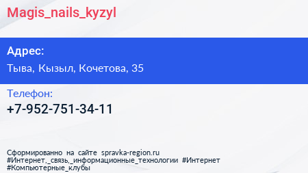 Magis_nails_kyzyl по адресу Тыва, Кызыл, Кочетова, 35 в дальнейшем Организация, размещена в следующих категориях: