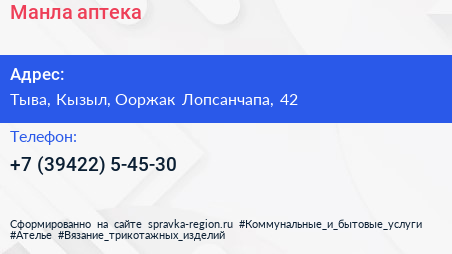 Манла, аптека по адресу Тыва, Кызыл, Ооржак Лопсанчапа, 42 в дальнейшем Организация, размещена в следующих категориях: