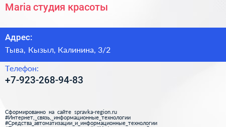Maria, студия красоты по адресу Тыва, Кызыл, Калинина, 3/2 в дальнейшем Организация, размещена в следующих категориях: