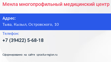 Менла, многопрофильный медицинский центр по адресу Тыва, Кызыл, Островского, 10 в дальнейшем Организация, размещена в следующих категориях: