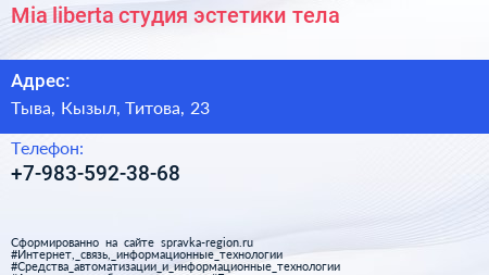 Mia liberta, студия эстетики тела по адресу Тыва, Кызыл, Титова, 23 в дальнейшем Организация, размещена в следующих категориях: