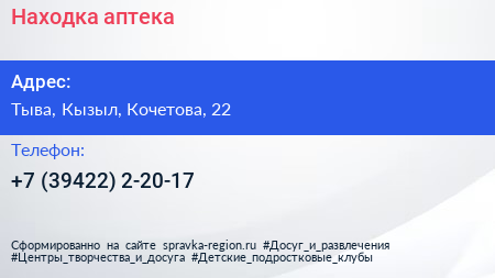 Находка, аптека по адресу Тыва, Кызыл, Кочетова, 22 в дальнейшем Организация, размещена в следующих категориях: