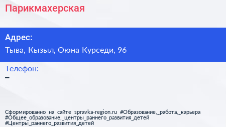 Парикмахерская по адресу Тыва, Кызыл, Оюна Курседи, 96 в дальнейшем Организация, размещена в следующих категориях: