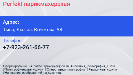 Perfekt, парикмахерская по адресу Тыва, Кызыл, Кочетова, 98 в дальнейшем Организация, размещена в следующих категориях: