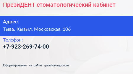 ПрезиДЕНТ, стоматологический кабинет по адресу Тыва, Кызыл, Московская, 106 в дальнейшем Организация, размещена в следующих категориях:
