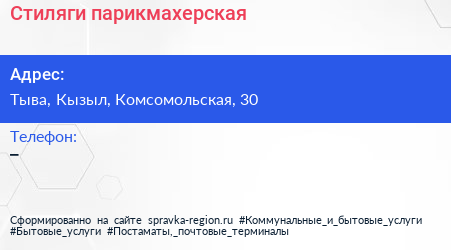 Стиляги, парикмахерская по адресу Тыва, Кызыл, Комсомольская, 30 в дальнейшем Организация, размещена в следующих категориях: