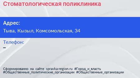 Стоматологическая поликлиника по адресу Тыва, Кызыл, Комсомольская, 34 в дальнейшем Организация, размещена в следующих категориях: