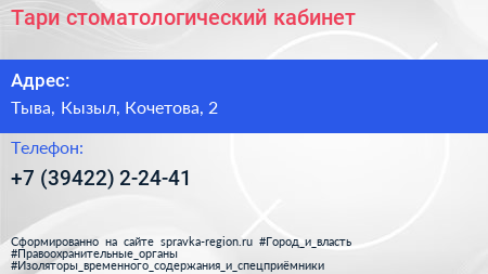Тари, стоматологический кабинет по адресу Тыва, Кызыл, Кочетова, 2 в дальнейшем Организация, размещена в следующих категориях: