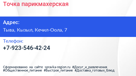 Точка, парикмахерская по адресу Тыва, Кызыл, Кечил-Оола, 7 в дальнейшем Организация, размещена в следующих категориях: