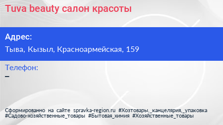 Tuva beauty, салон красоты по адресу Тыва, Кызыл, Красноармейская, 159 в дальнейшем Организация, размещена в следующих категориях: