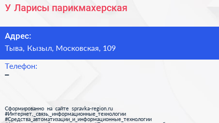 У Ларисы, парикмахерская по адресу Тыва, Кызыл, Московская, 109 в дальнейшем Организация, размещена в следующих категориях: