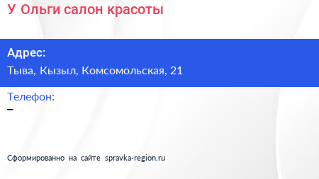 У Ольги, салон красоты по адресу Тыва, Кызыл, Комсомольская, 21 в дальнейшем Организация, размещена в следующих категориях: