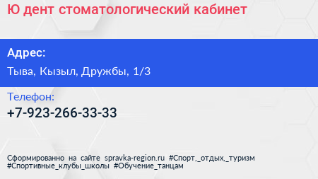 Ю-дент, стоматологический кабинет по адресу Тыва, Кызыл, Дружбы, 1/3 в дальнейшем Организация, размещена в следующих категориях: