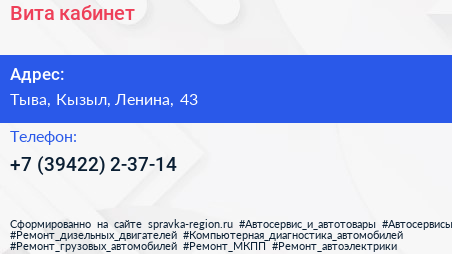 Вита, кабинет по адресу Тыва, Кызыл, Ленина, 43 в дальнейшем Организация, размещена в следующих категориях: