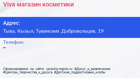 Viva, магазин косметики по адресу Тыва, Кызыл, Тувинских Добровольцев, 19 в дальнейшем Организация, размещена в следующих категориях: