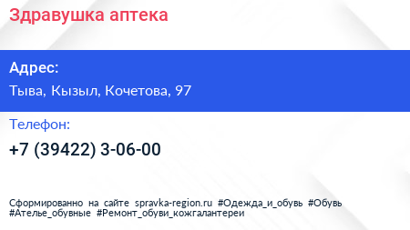 Здравушка, аптека по адресу Тыва, Кызыл, Кочетова, 97 в дальнейшем Организация, размещена в следующих категориях: