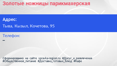 Золотые ножницы, парикмахерская по адресу Тыва, Кызыл, Кочетова, 95 в дальнейшем Организация, размещена в следующих категориях: